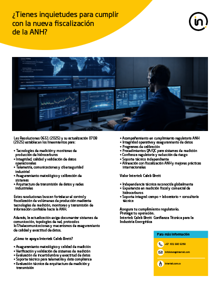 Soluciones Avanzadas en Medición y Monitoreo de Hidrocarburos. En Intertek Caleb Brett, ofrecemos un conjunto de servicios de telemetría, medición de hidrocarburos, y monitoreo de producción para cumplir con las normativas más exigentes, como las Resoluciones 0651 y 0708 de la ANH (Agencia Nacional de Hidrocarburos).